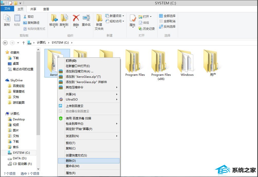 7、卸载完毕还需要网友手动删除C/AeroGlass文件夹。